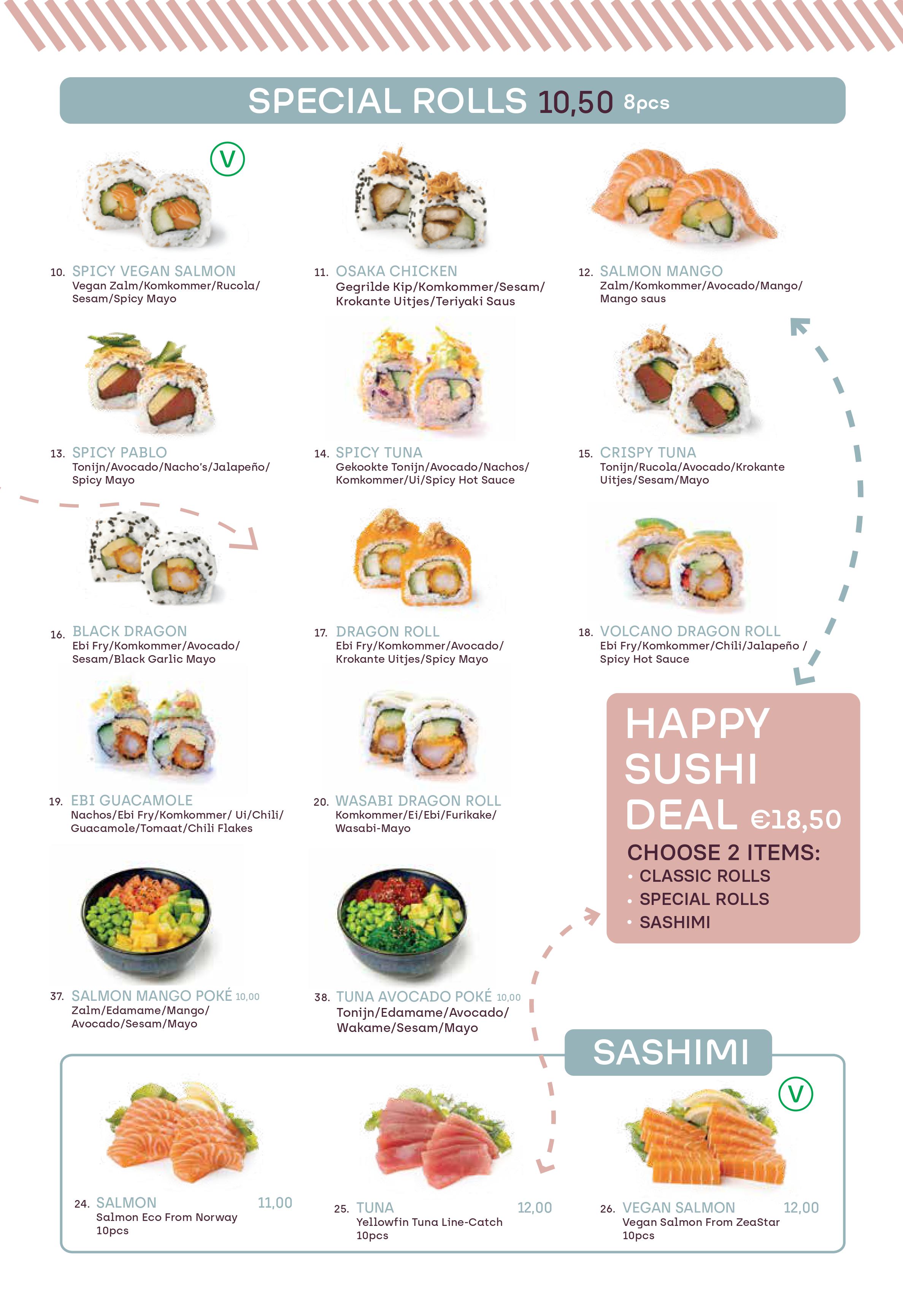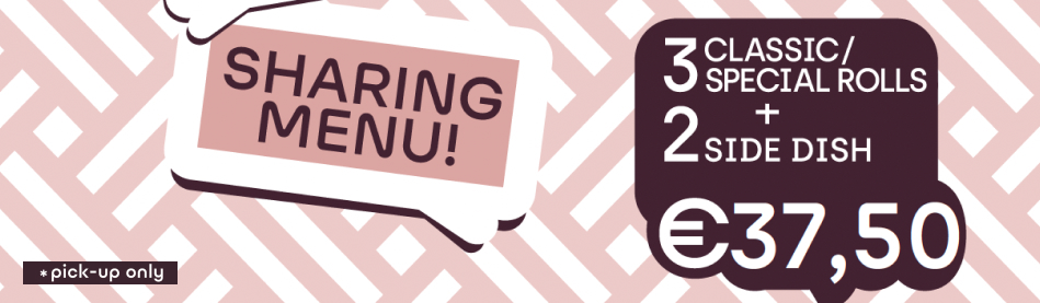 Sharing is caring and creates HAPPY faces! Met het Sharing Menu kun je kiezen uit drie van de CLASSICS of SPECIAL ROLLS en ontvang je twee side dishes voor maar €35,00. Let op: deze deal is alleen geldig bij afhaal.